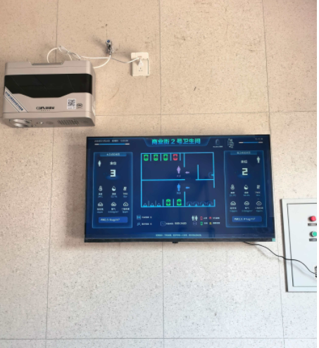 1、進入公廁我們就可以看到引導大屏,大屏上面顯示每個廁所的環(huán)境指數,坑位占用情況,紅綠表示占用,綠色表示空閑,信息一目了然。